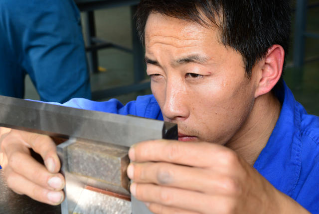 10月20日,参赛选手在钳工实操比赛中查看部件加工精度。