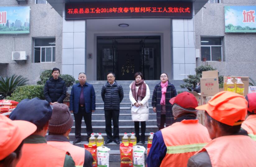 2月7日上午,县委常委、宣传部长李斌,县总工会主席张诗泉,为奋战在一线的150名环卫工人送去4.5万余元的粮油慰问品,并送上亲切的问候和节日的祝福。