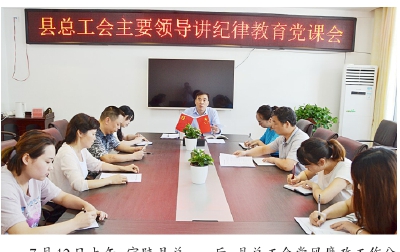 7月12日上午,宁陕县总工会组织全体干部职工开展了纪律教育学习宣传活动。群团党组书记、县总工会主席柯小伟以“在工会工作实践中遵规守纪”为主题的党课讲授成为本次活动的亮点。党课结束后,县总工会党风廉政工作分管领导组织全体干部学习了《党员干部纪律教育读本》,结合工会实际情况,通过读反面教材的介绍和举例,让各党政干部更加敬畏纪律,严守纪律。(罗有涛 周昊 摄)