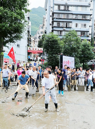 为尽快恢复生产生活秩序,县总发动各基层工会迅速组织力量,带领职工群众克服“等、靠、要”思想,全面开展生产自救,最大限度减轻灾害造成的损失。供水、电力、通讯、卫生等行业工会组织专业技术人员,快速行动,为及早恢复正常生产生活秩序提供基础保障。全县干部职工积极投入灾后环境整饬,在受灾严重的县城中心广场、三河口广场、狮凤路主干道等地集中开展灾后清淤。正用自己发明的清淤神器“门板推淤机”在县城东门广场清理淤泥的县扶贫办干部王胜涛顾不上擦拭顺着脸颊流向胸膛的汗水,一推推将没过腿肚的淤泥推向已经堆成小山的淤泥堆,他笑着说:“灾后清淤大家都干得攒劲地很,虽然没人监督、没人指挥,大家也干得膀子都抬不起了,我的想法很简单,这个活很有价值,铲一锨淤泥,广场就少一锨;不说为大家,我以后要从这里过路,孩子更要带来在这里玩耍,这汗流的不亏,明天需要的话,继续参加!”