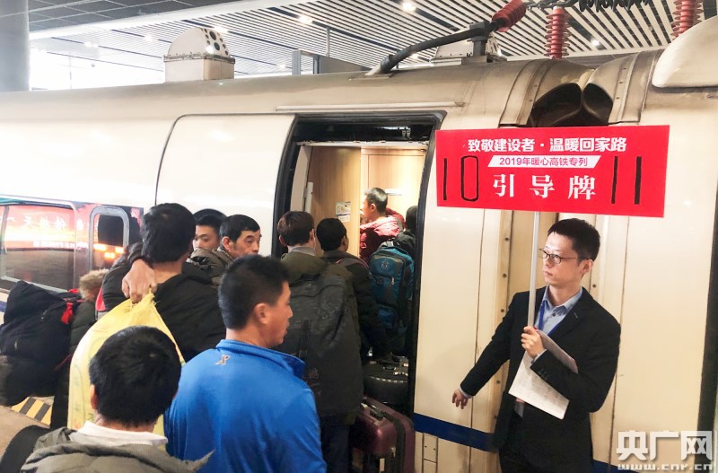 1月28日11时20分,在西安北站一站台, 500多名四川籍在陕务工人员从铁路工作人员手中接过新年礼包,有序登上开往成都的D1929次动车,踏上回家团圆的旅程,顺利将乘车的民工送抵沿途站点。据悉,这是陕西开行的首趟免费“暖心高铁专列”。