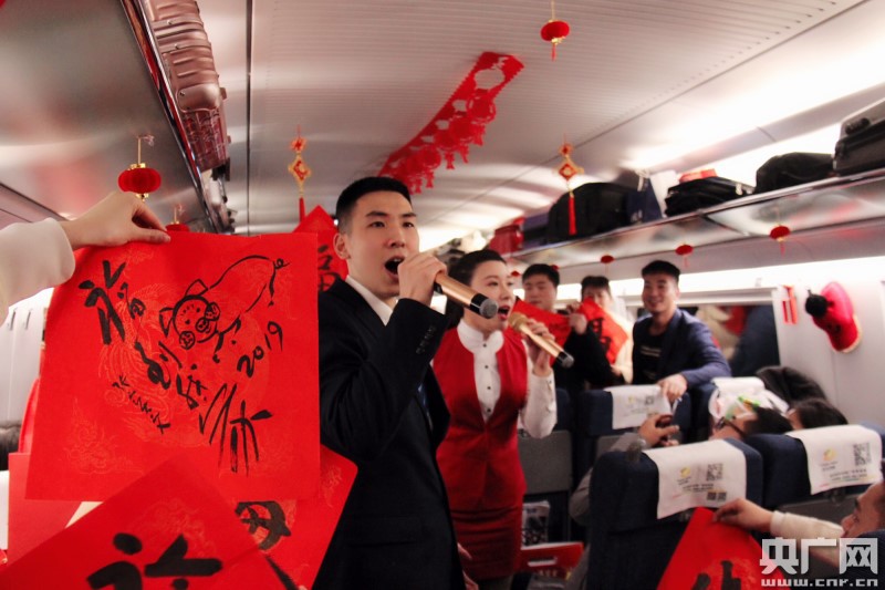 记者在车厢看到,浓浓的年味扑面而来,红色的小灯笼、喜庆的窗花将宽敞舒适的车厢装扮的喜气洋洋。“祝您春节快乐!”“猪年大吉”“西安客运段给你拜年了!”等问候语让人心生暖意。旅途中,西安客运段列车工作人员还为务工人员带来了丰富多彩的歌舞表演,赠送春联、“福”字、小“金猪”,送去铁路人的新年祝福。