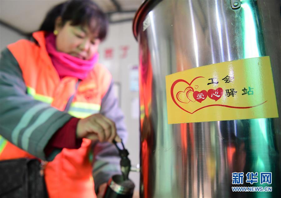 11月20日,环卫工人在西安市莲湖区大庆路一处“工会爱心驿站”内吃午饭。西安市总工会从2017年7月开始在全市建立“工会爱心驿站”,为包括环卫工人、出租车司机、交警及城管执法人员、市政园林工、快递外卖员等在内的户外工作者提供服务,解决他们“吃饭难、喝水难、休息难、如厕难”等实际问题。截至目前,西安已建成“工会爱心驿站”105个,免费服务2万人次以上。(记者 邵瑞 摄)