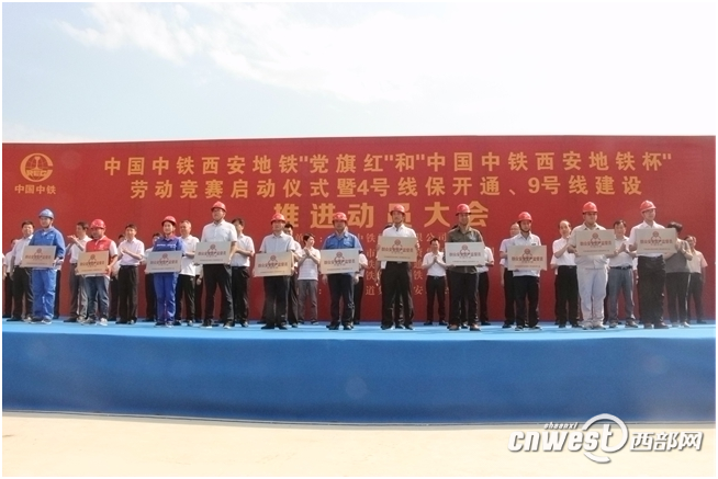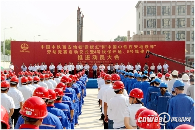 中国中铁西安地铁党旗红、西安地铁杯劳动竞赛仪式结束后,随之召开了9号线施工生产推进会、4号线保开通动员大会,中国中铁副总裁、总工程师刘辉,西安地铁办主任、西安市地下铁道有限责任公司总经理宋扬等领导对9号线促在建,4号线保开通工作提出了要求。