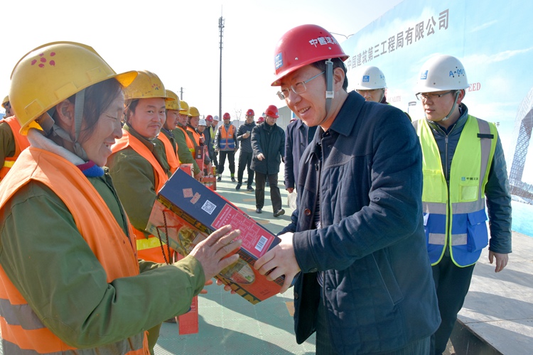 张剑一行到施工工地现场慰问工友,“你多大年纪了?”“家在哪里?”“过年回去的票买了吗?”“家里孩子多大了?”他一边向奋战在一线的农民工兄弟送去年货大礼包,一边询问工友工资发放情况、生活有无困难等问题,他紧握工友们的手,叮嘱着他们冬季施工注意防寒保暖并预祝工友们新春快乐。