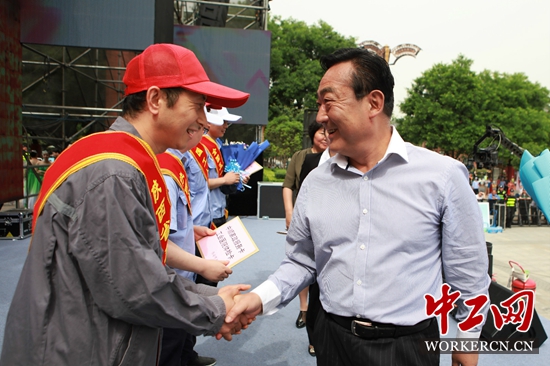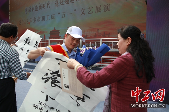 西安市总工会主席史南征,西安市曲江新区工会工委主任寇雅玲为荣获全国五一劳动奖章、全国工人先锋号、陕西省五一劳动奖状、奖章和陕西省工人先锋号称号的9名代表送上了鲜花和礼品。省、市书法家协会书法家为获奖人员赠送了书法作品。(记者 曲欣悦 通讯员 王海)