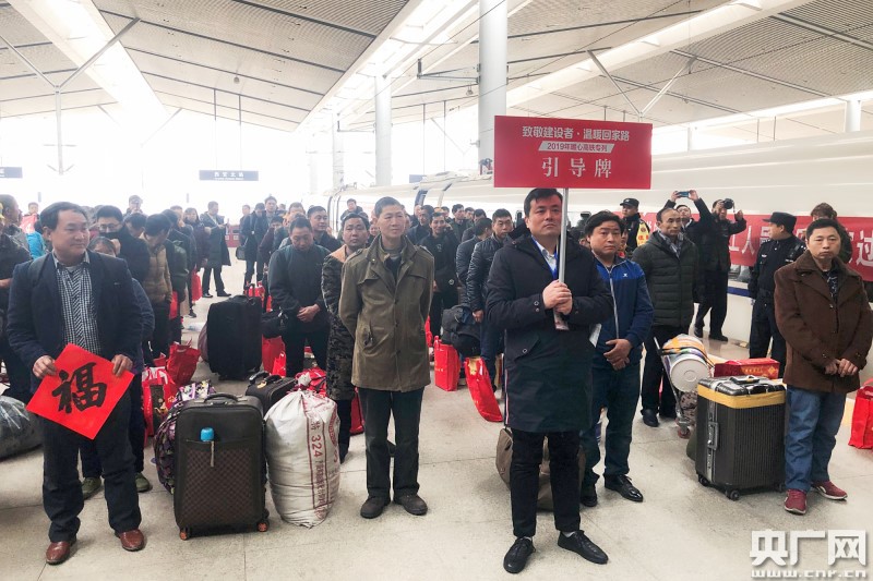 1月28日11时20分,在西安北站一站台, 500多名四川籍在陕务工人员从铁路工作人员手中接过新年礼包,有序登上开往成都的D1929次动车,踏上回家团圆的旅程,顺利将乘车的民工送抵沿途站点。据悉,这是陕西开行的首趟免费“暖心高铁专列”。